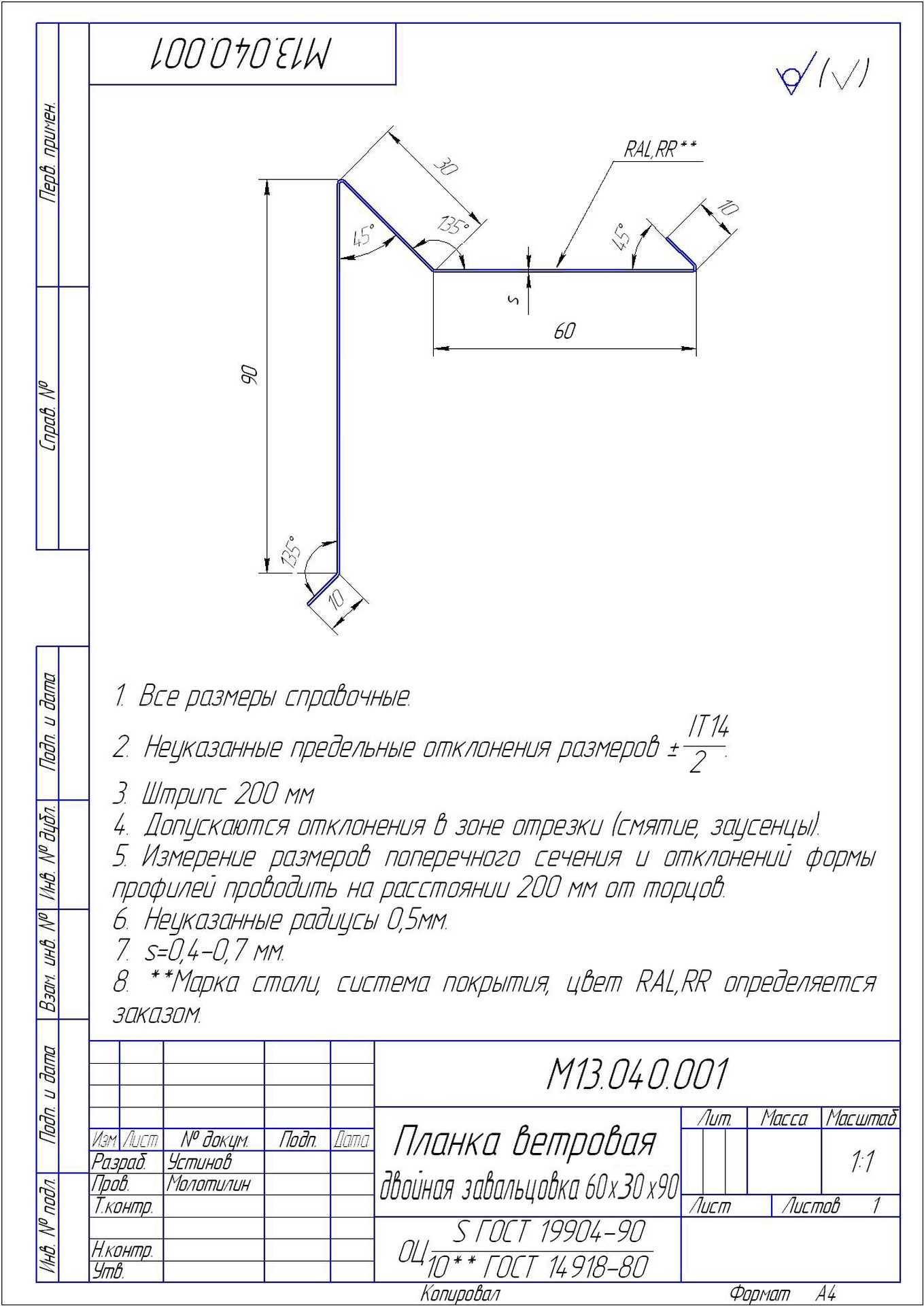 Планка ветровая для мягкой кровли двойная завальцовка 60х30х90 0,45 Drap ST RAL 8017 шоколад